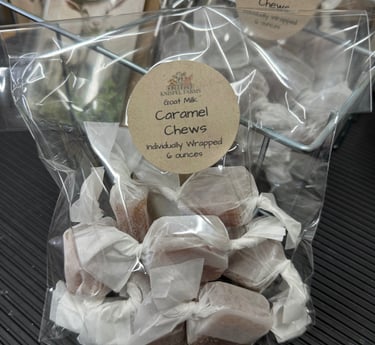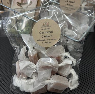 Chewy Caramels Savor the delight of our chewy caramels, each piece handcrafted for optimal texture and flavor. Infused with the richness of fresh goat milk, these caramels offer a unique twist on a classic favorite. Each bite delivers a satisfying chewiness that melts away, revealing layers of caramel flavor that balance sweetness and creaminess. Individually wrapped for freshness, our chews make the perfect treat on-the-go or a delightful addition to any candy dish.